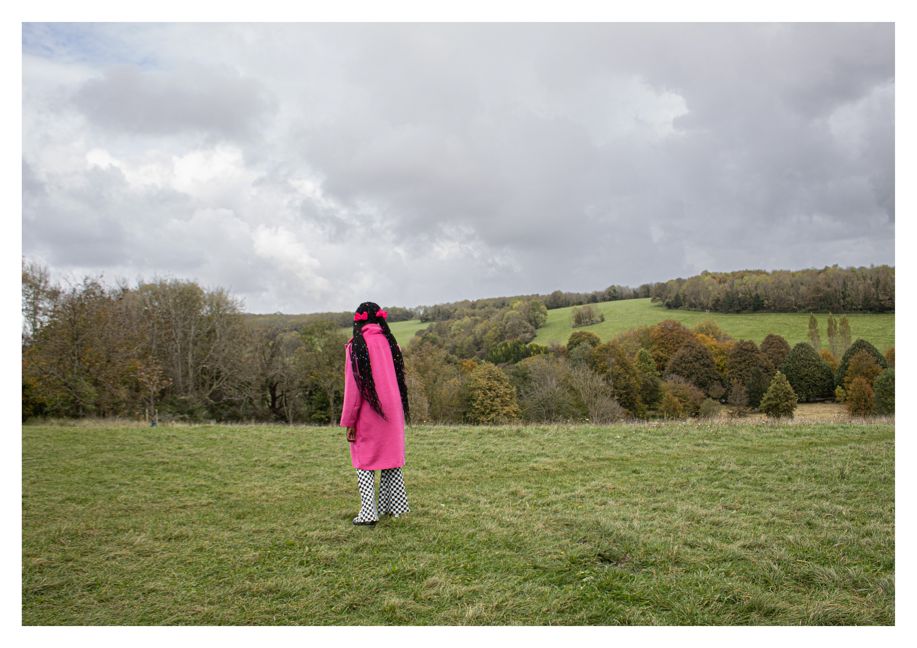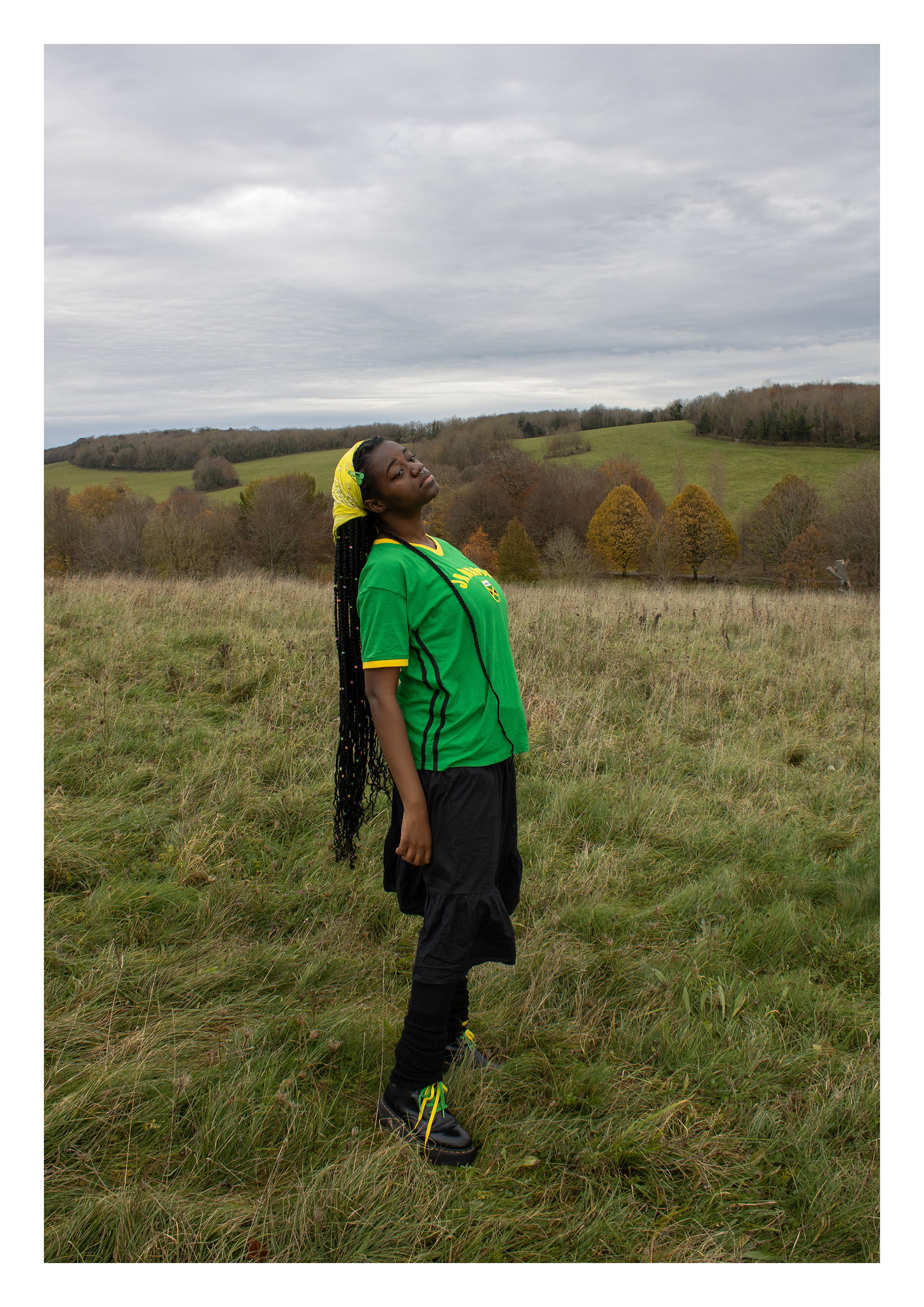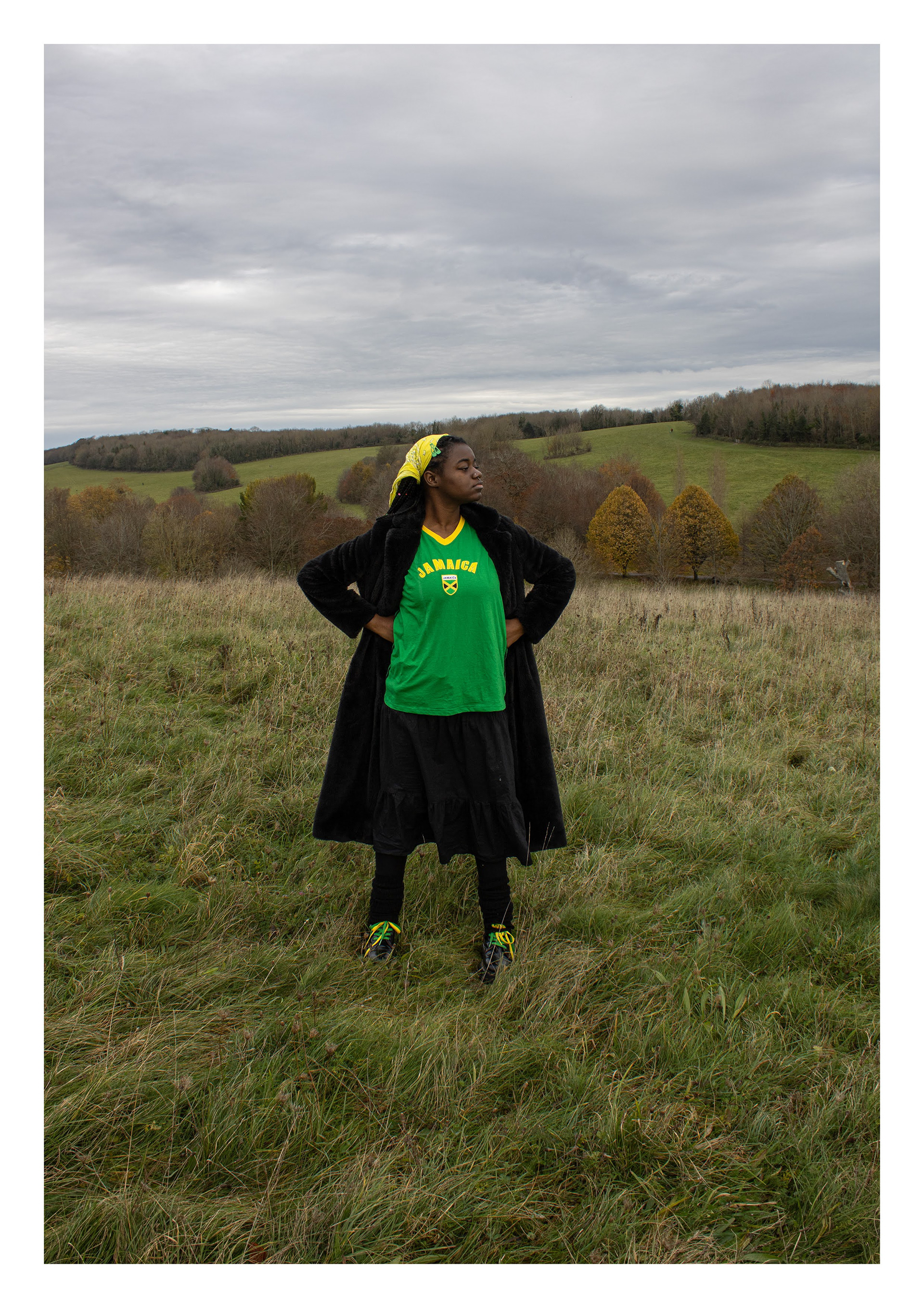 is a self-portrait photographic series exploring how rural Britain is often perceived as a predominantly white space by ethnic minorities. Using performative poses and clothing, the work creates striking juxtapositions with the landscape to evoke feelings of alienation - serving as metaphors for broader racial issues and the concept of ‘White Spaces’.
