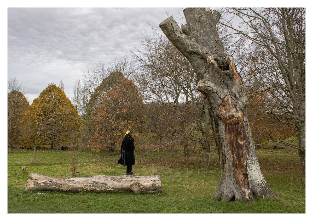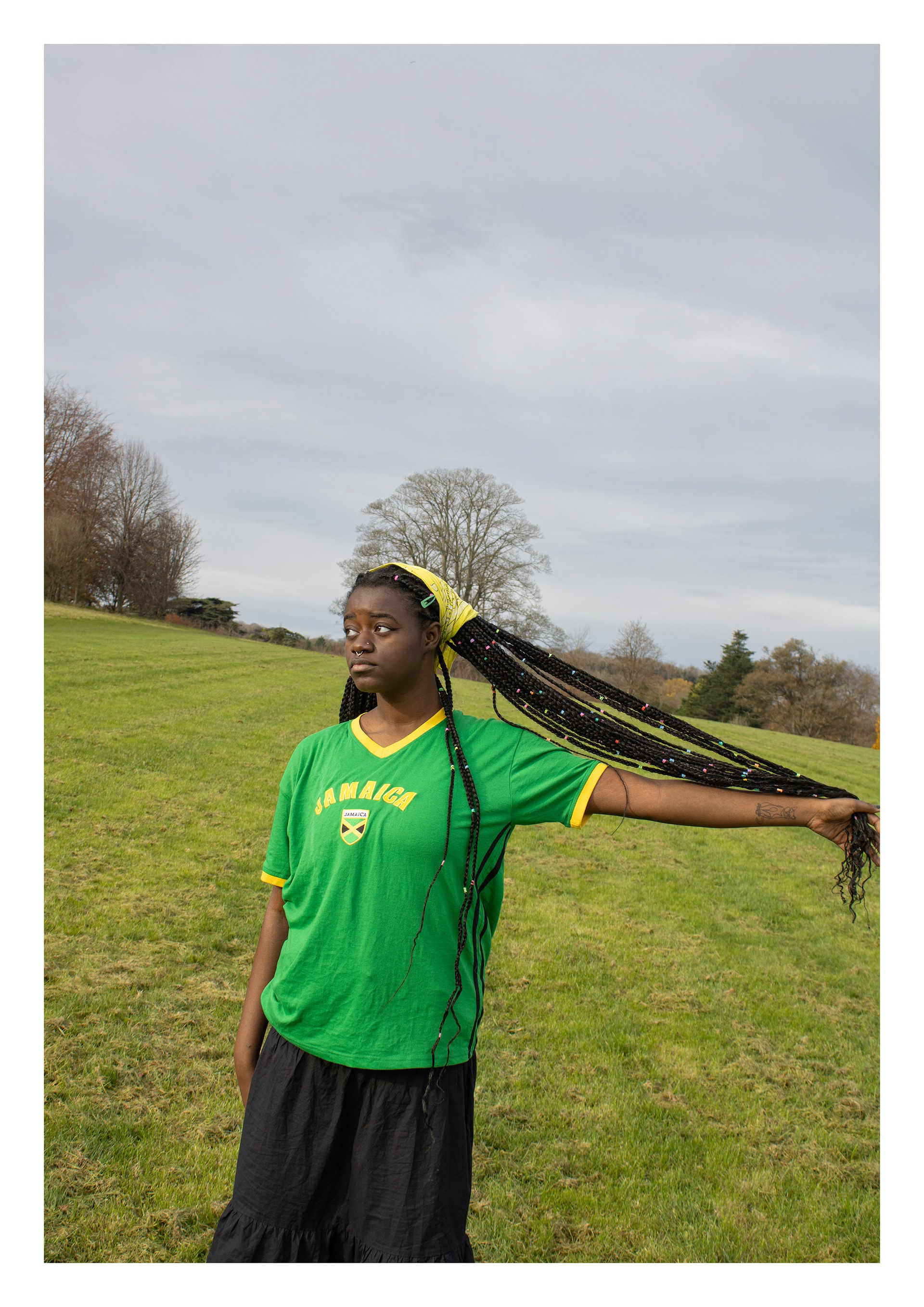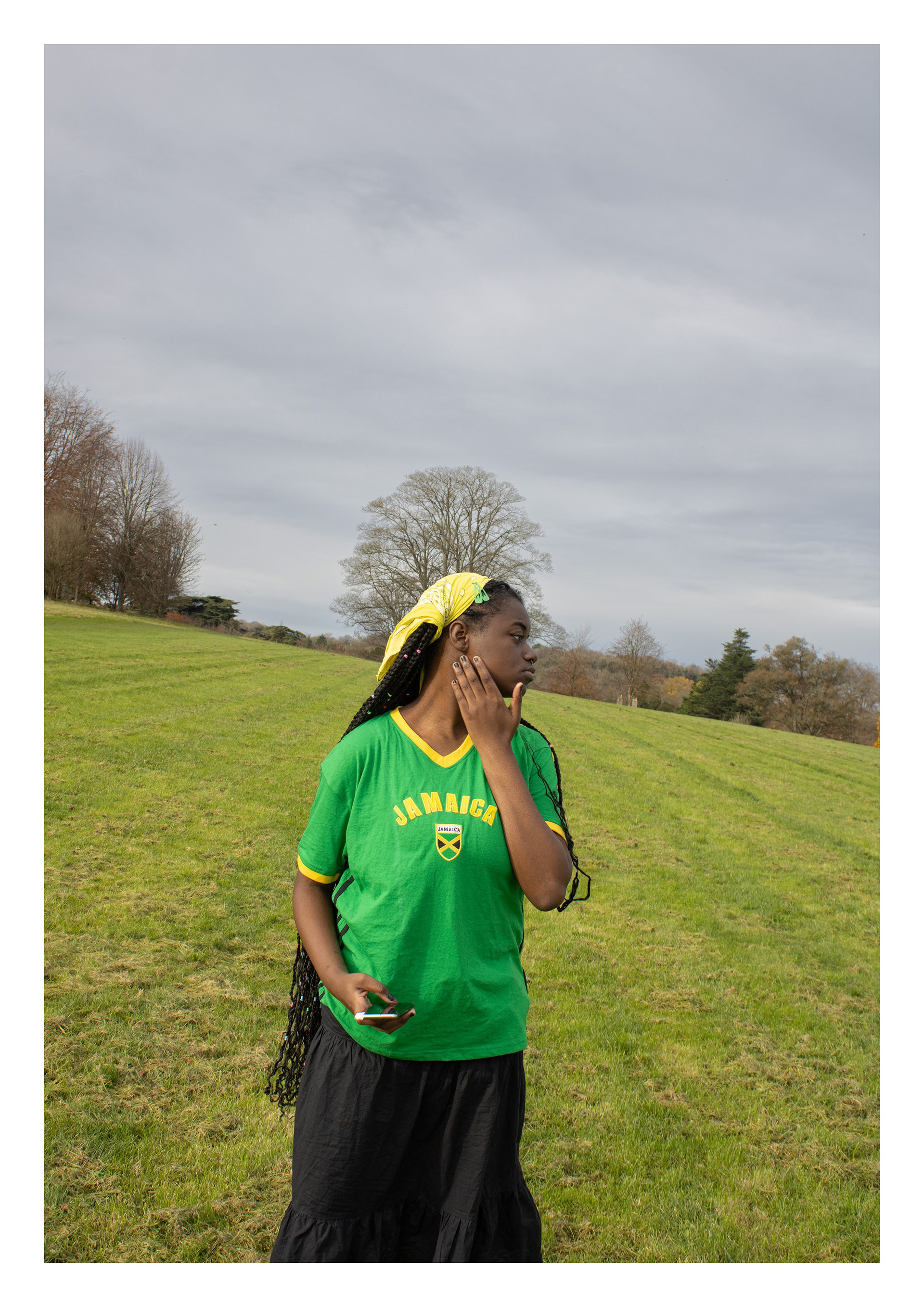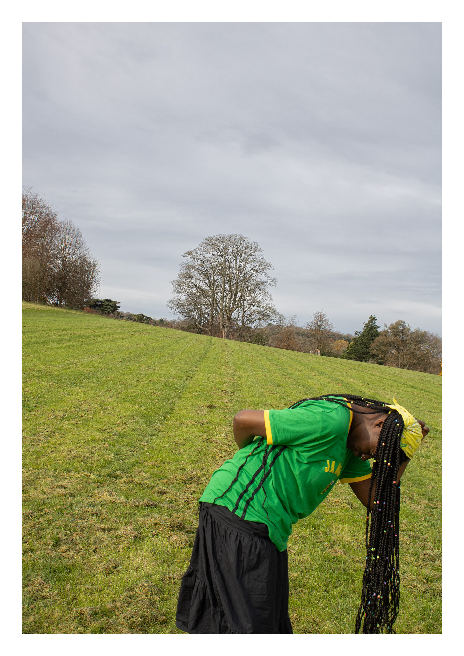 is a self-portrait photographic series exploring how rural Britain is often perceived as a predominantly white space by ethnic minorities. Using performative poses and clothing, the work creates striking juxtapositions with the landscape to evoke feelings of alienation - serving as metaphors for broader racial issues and the concept of ‘White Spaces’.