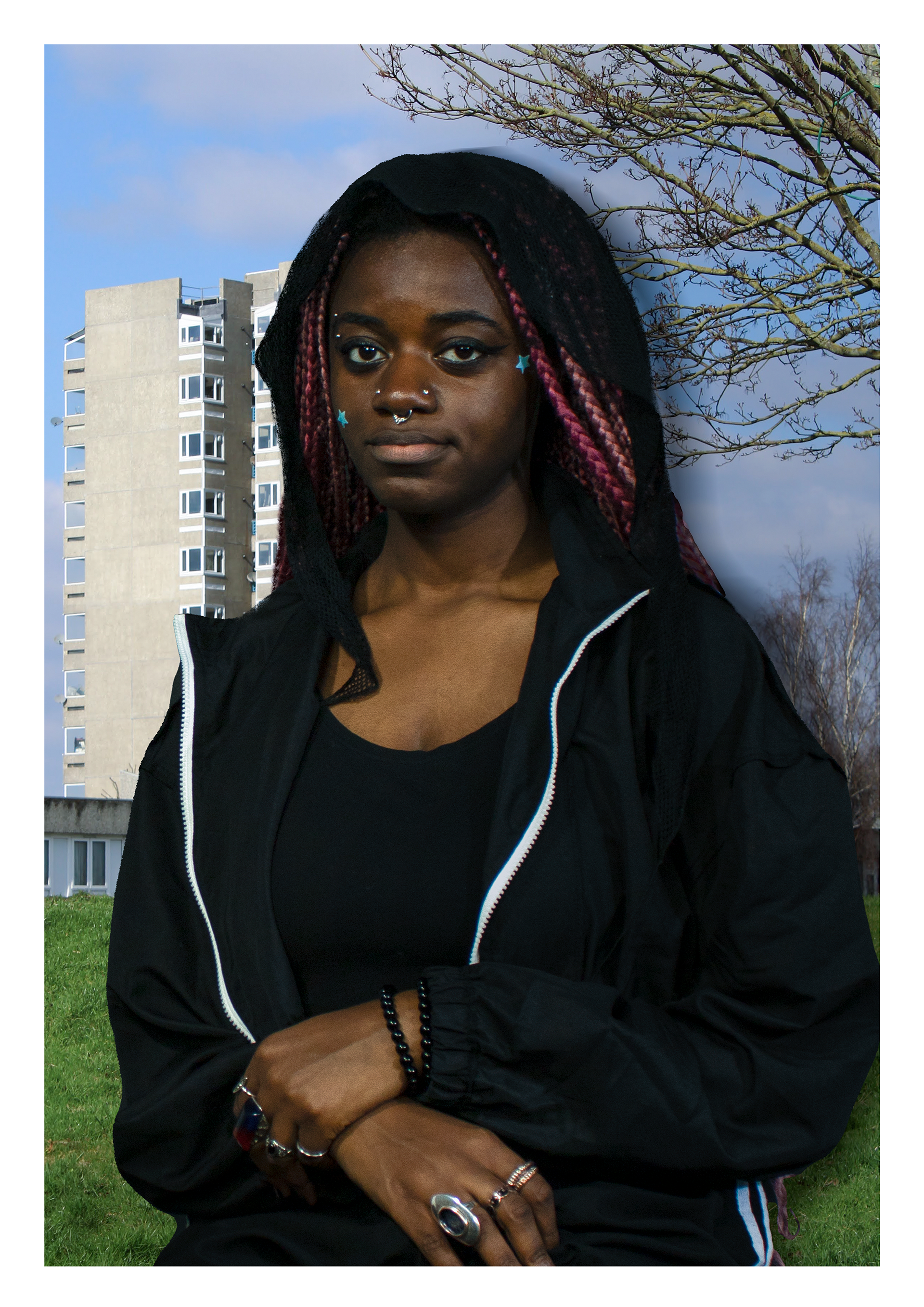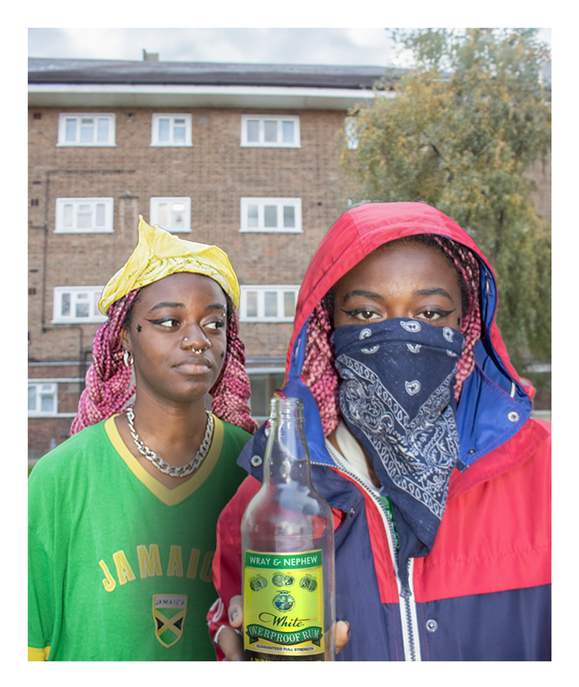 This reimagining of Grant Wood's American Gothic explores Black and British identity, subverting the original's portrayal of rural American values. While the original embodies white, middle-American tradition, my version blends British stereotypes, Jamaican iconography, and contemporary identity.