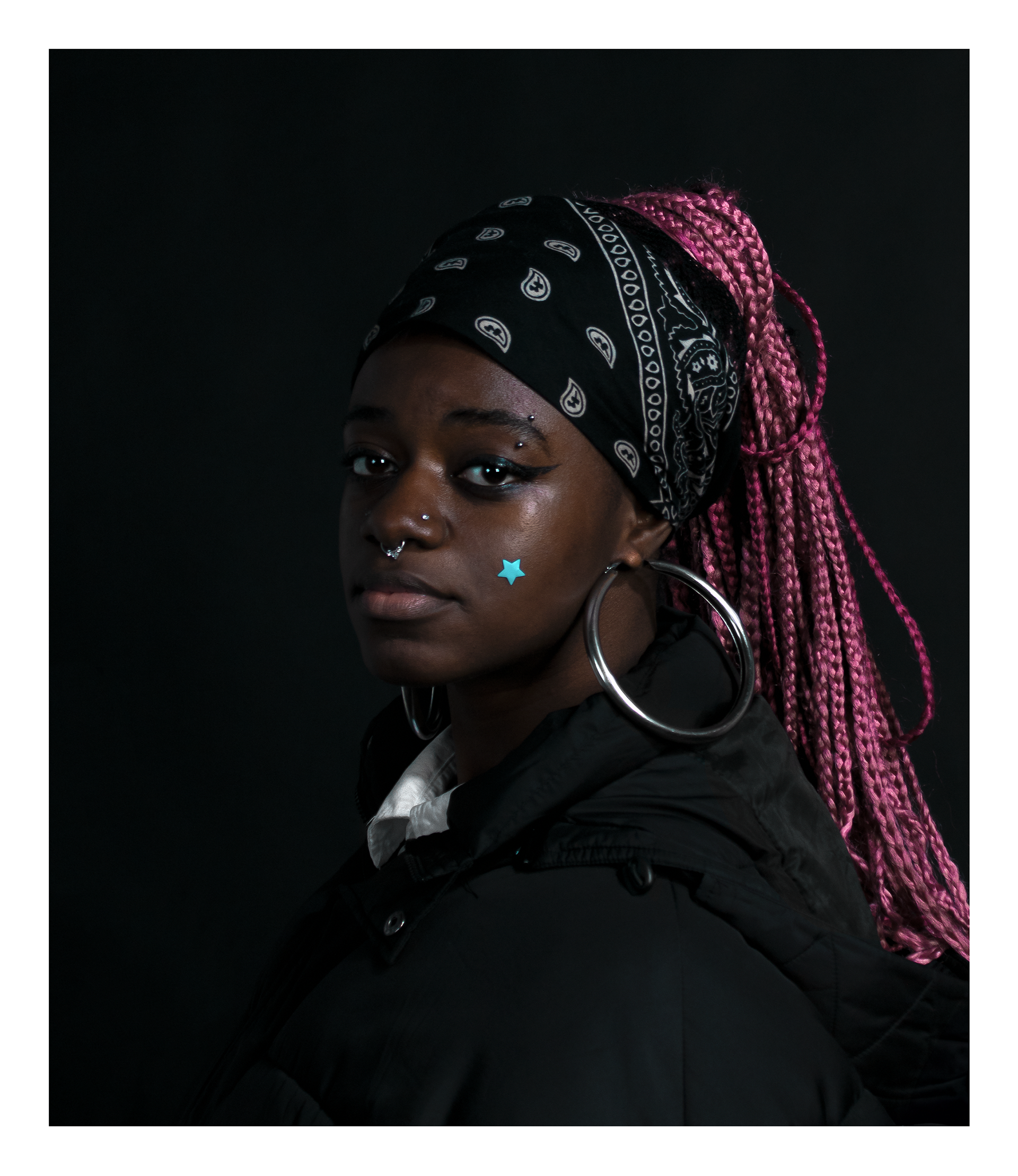 This reimagining of Girl with a Pearl Earring examines the absence of Black presence in historical art, using cultural signifiers like a large hooped earring associated with Black women. Through subtle humor and reappropriation of stereotypes, the piece encourages new narratives and reflections on identity.