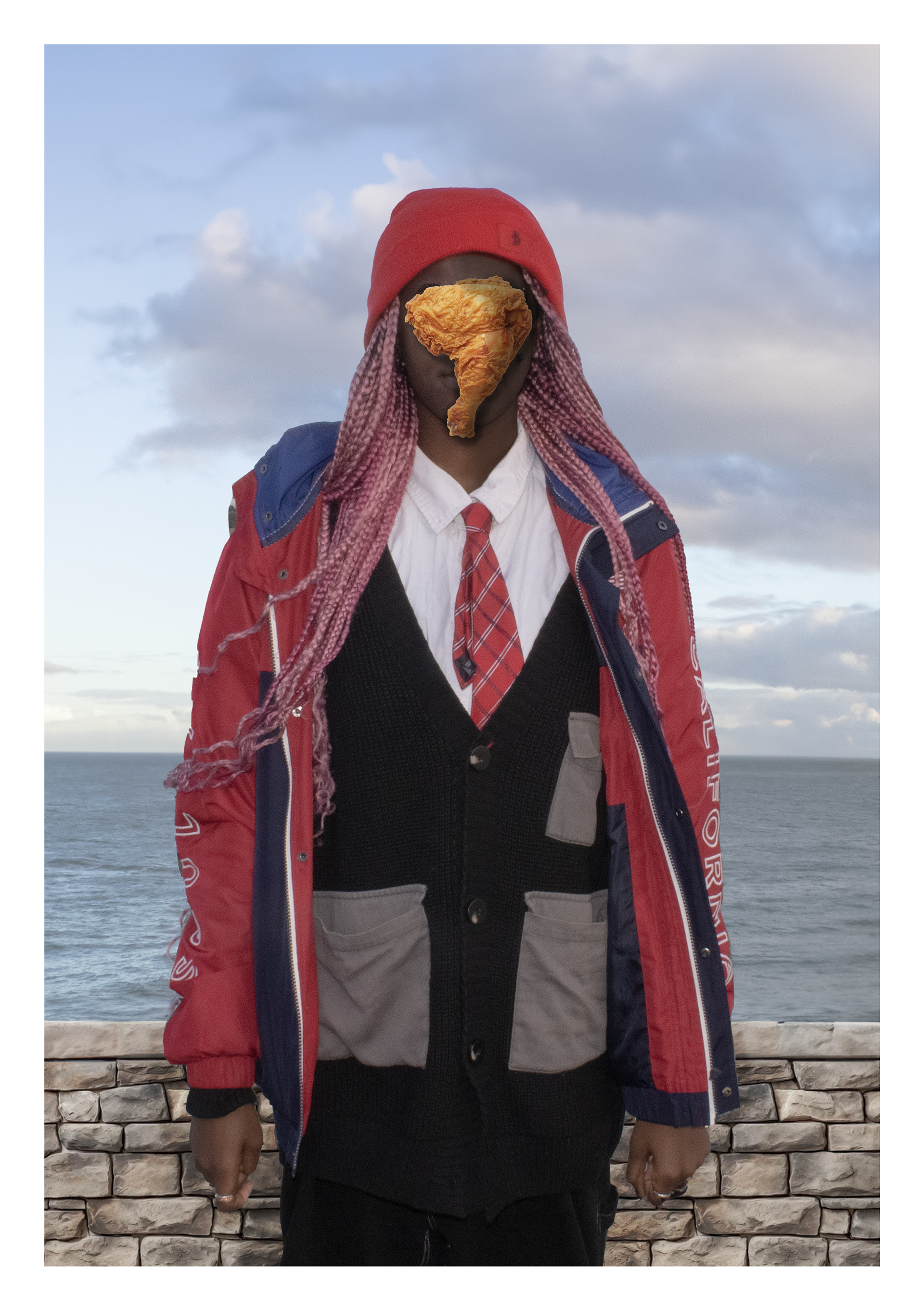This reinterpretation of René Magritte’s The Son of Man replaces the iconic apple with fried chicken, a deliberate reference to racial stereotypes about Black culture. This shift juxtaposes Magritte’s exploration of hidden identity with a modern critique of how identity is often reduced to simplistic caricatures.