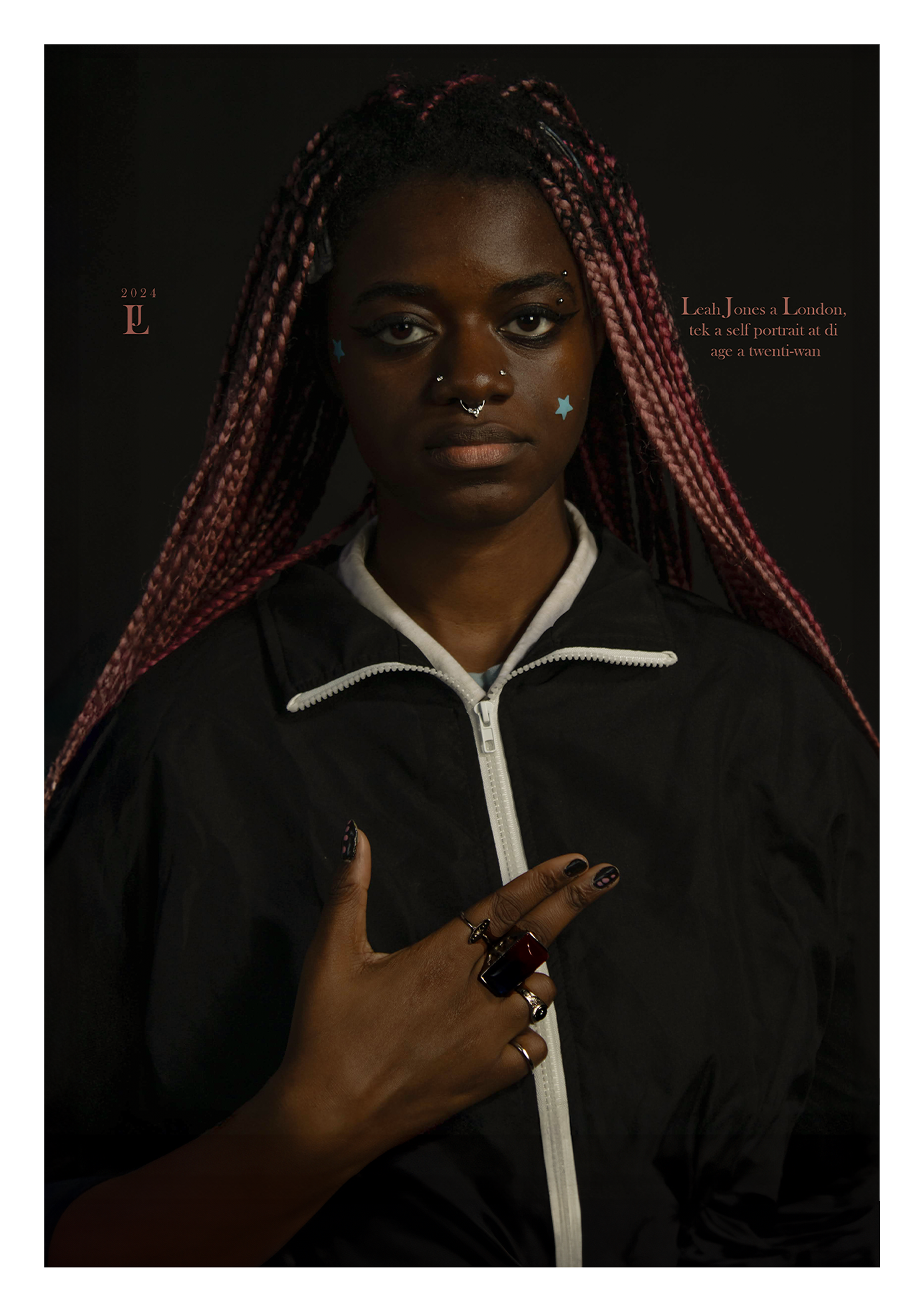 My reinterpretation of Albrecht Dürer’s Self-Portrait at 28 blends personal and cultural identity with art historical critique. Dürer’s original, known for its Christ-like symbolism and assertion of artistic divinity, is reimagined to reclaim space in a tradition that has long excluded people of colour. Replacing the Latin inscription with Jamaican Patois honors my heritage and linguistic identity, while a playful “gun” hand gesture replaces Dürer’s blessing, subverting the solemnity of the original.