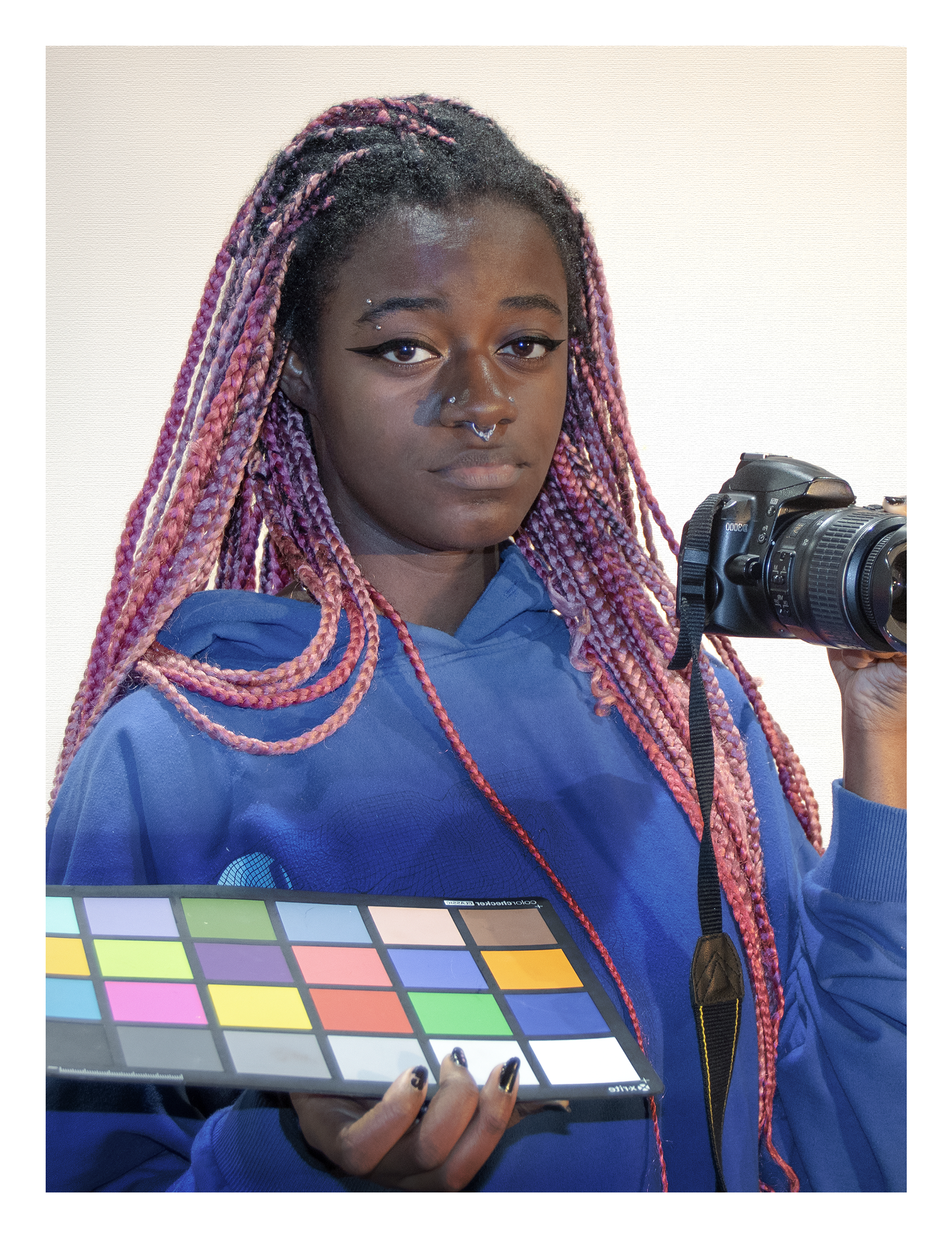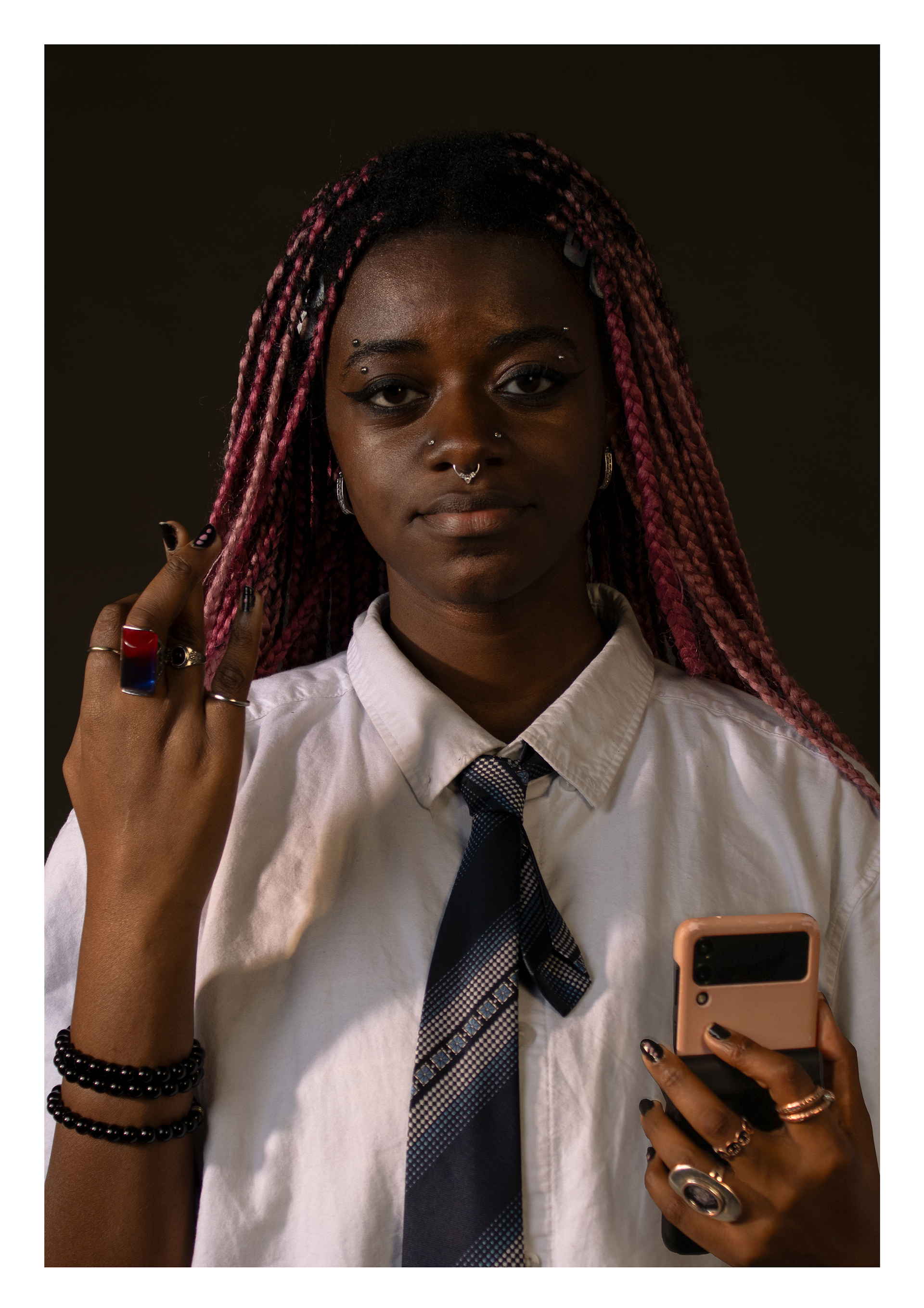 In this reimagining of Salvator Mundi, I replace the traditional orb with a phone, reflecting how spirituality and technology now coexist. Originally portraying a white, masculine ideal, the image is reworked through the lens of a Black female photographer to challenge Western norms of divinity, power, and representation. This piece confronts colonial legacies and explores identity at the intersection of race, gender, and authority.